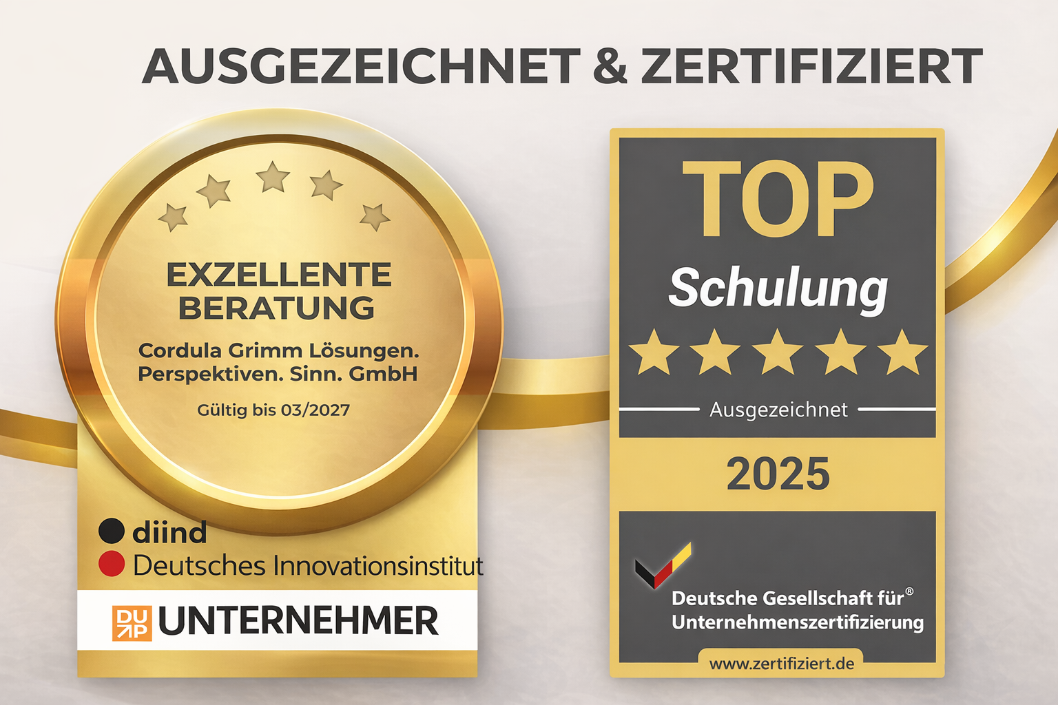 Mit den Auszeichnungen „Top Trainer 2025“ und „Exzellente Beratung“ wird sichtbar, wofür Cordula Grimm Lösungen. Perspektiven. Sinn. GmbH steht: für Führung, die nicht an der Oberfläche bleibt. Für Klarheit, die Verantwortung schärft. Für Entwicklung, die nicht in Konzepten endet, sondern im Alltag wirkt.